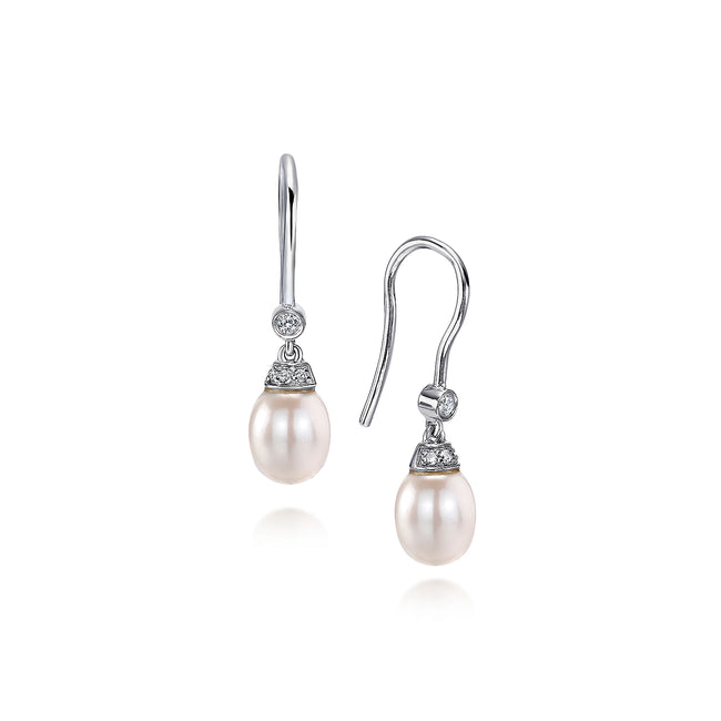 14K White Gold Cultured Pearl Diamond Fish Hook Drop Earrings